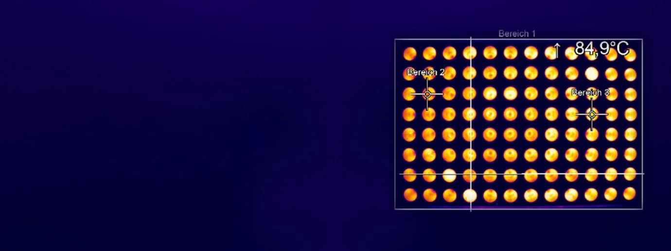 An infrared camera is installed above the samples to monitor temperatures without contact. The real-time measurement enables accurate control of the PCR cycle, ensuring consistent temperatures and automatic adjustment when deviations are detected.