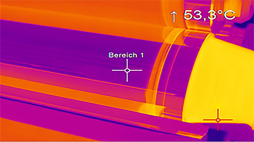 CT LT sensors have been employed in an application producing inexpensive plastic packaging for grocery food items. Long-wavelength sensors are sufficient since the plastic film is thicker than 400 µm. The manufacturer has integrated several pyrometers in a line to monitor temperature inhomogeneities. If the temperature readings differ, the programmable logic controller (PLC) adjusts the power of the infrared heaters based on the temperature data received over analog inputs. The online thermometers are installed next to the infrared heaters, where the plastic film reaches its maximum temperature, to avoid any parasitic reflections. Despite this, the ambient temperature is significant, so the sensor must withstand temperatures.