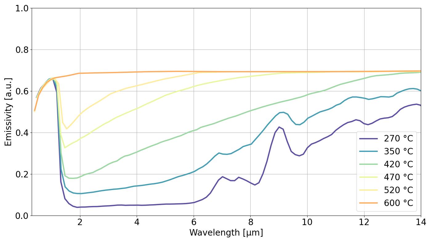 Silicon’s emissivity varies with temperature, wavelength, and surface characteristics, resulting in complex behavior across different spectral ranges.
