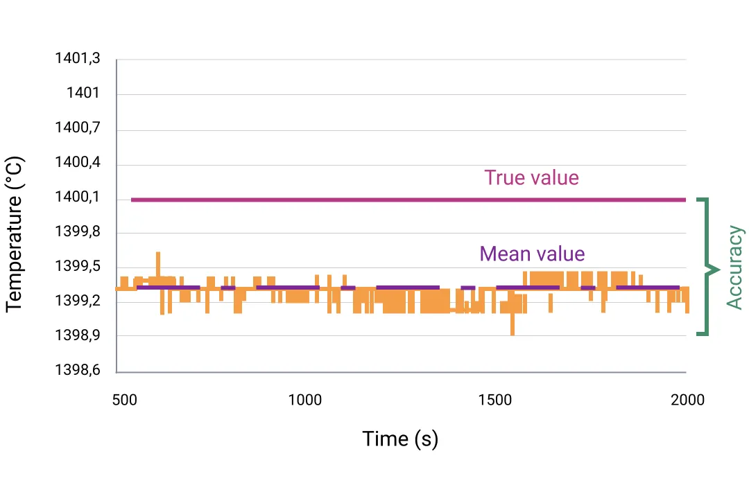 The true temperature value can only be reliably determined using a transfer standard traceable to the international temperature scale. This could be a pyrometer calibrated by a national metrological institute (such as the Physikalisch-Technische Bundesanstalt in Germany) or an accredited laboratory. Every measurement has a certain degree of uncertainty, caused by factors like signal noise. Therefore, accuracy is expressed statistically. Typically, measuring accuracy is stated as: (+/- 1K, k = 2).