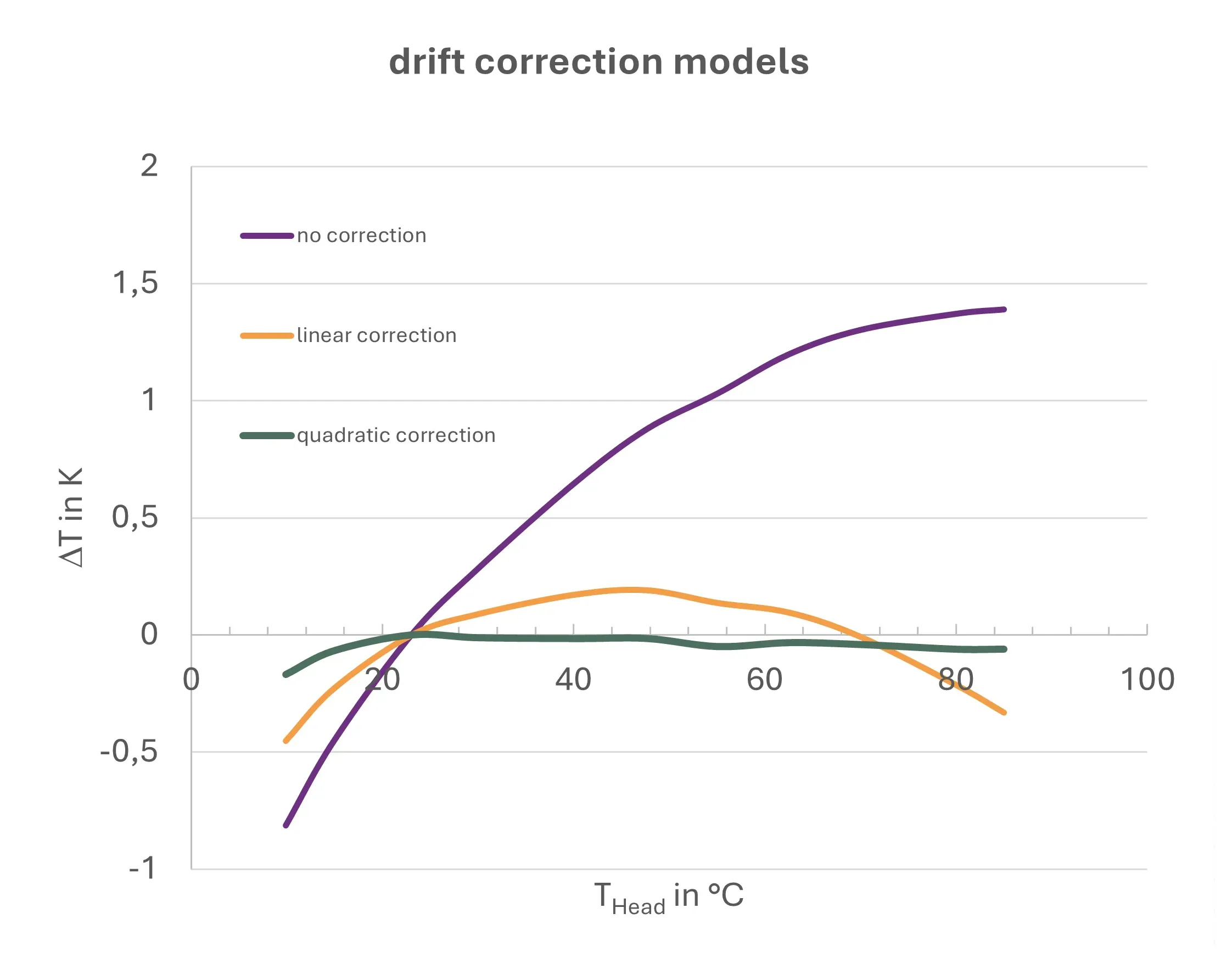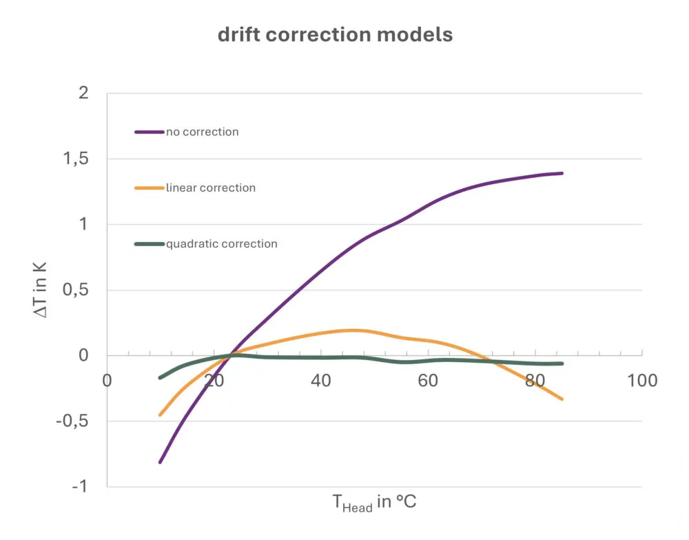 Most manufacturers strive to minimize signal drift due to intrinsic temperature changes. In some cases, the detector temperature is stabilized by technical measures, either by heating or cooling to a defined temperature. Alternatively, the detector temperature can be measured, and any signal fluctuations dependent on this can be compensated for by a physical model stored in the device firmware.