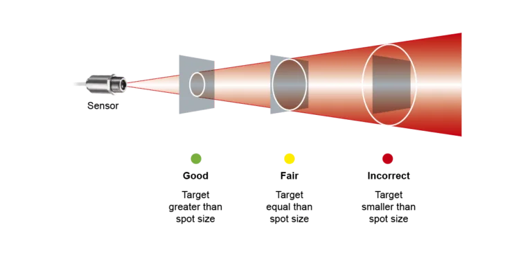 In devices with adjustable focus, a single D:S ratio is applied for the entire measurement range. Although the spot size increases with distance, the ratio remains constant. Conversely, in fixed focus devices, such as compact pyrometers, the D:S ratio is given for a specific focal distance only. Shifting the target out of focus decreases the D:S ratio, resulting in a smaller measurement spot and potential temperature deviations.