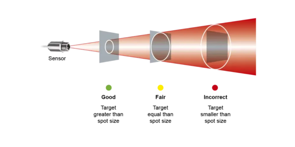 It is essential to ensure the object is larger than or at least equal to the measurement spot. Only ratio pyrometers can measure objects smaller than the measuring spot without causing inaccuracies leading to a signal attenuation of 80% or even 90%. To ensure accurate measurement, always check the measurement spot size of a pyrometer at a given distance and use a FOV or spot size calculator app.