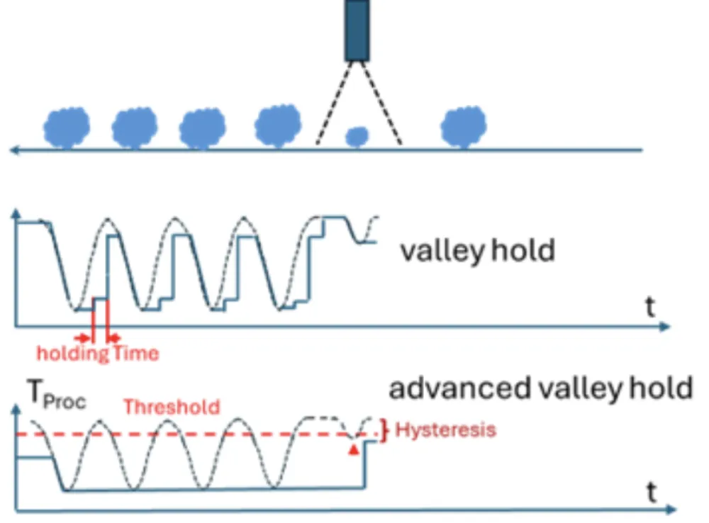 “Valley hold” is a crucial feature in temperature sensors like bolometers or pyrometers, enabling them to process measured data effectively at a low level. In Optris temperature sensors, valley hold refers to the ability to retain the lowest measured value over a specified period, called the “holding time,” and deliver this value as “TProc” to the sensor’s output. When enabled, the sensor continuously records temperature values and maintains the lowest temperature value detected. If the temperature rises above the lowest detected value, the holding time countdown begins.