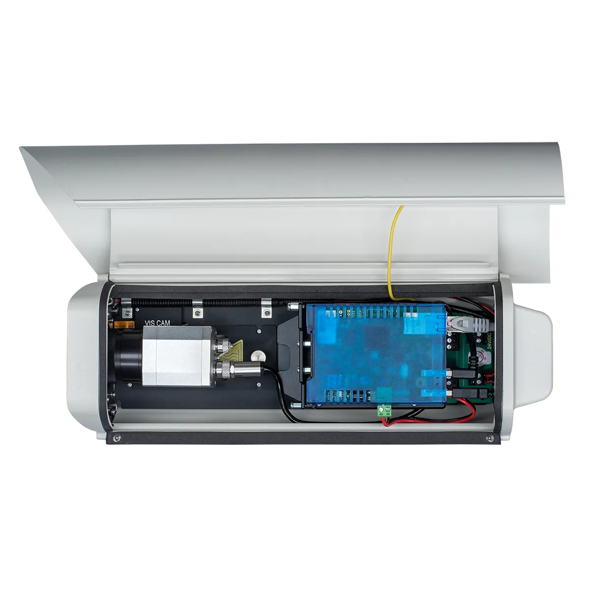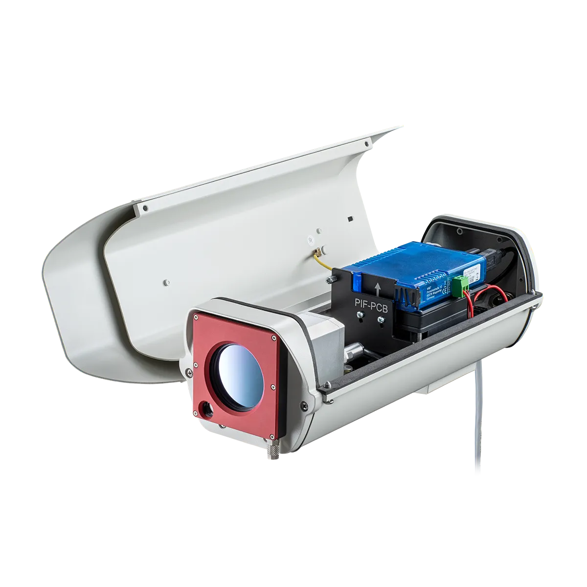 The PI 450i CM package meets the need for continuous monitoring in industrial outdoor environments. This comprehensive package integrates all essential components to effectively monitor equipment and fire hazards, providing early alarms when equipment overheats or when ignition temperatures indicate the onset of a fire. The package includes an infrared camera, an outdoor enclosure with a fan and heating element, a front window air purge, a high-definition video camera, and a USB Gigabit Server for long-distance video transmission.
