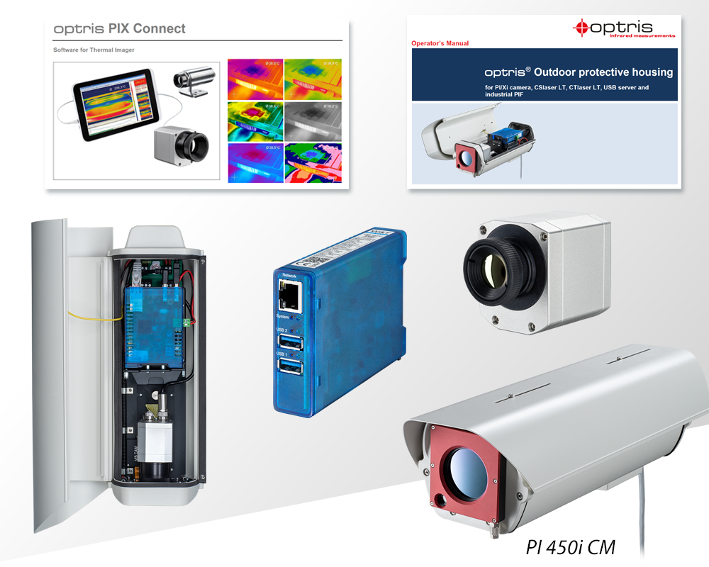 The PI 450i must be connected to a PC loaded with Optris PIX Connect software to produce thermal images and remote temperature measurements. By eliminating processing in the camera head and leveraging PC processing power, the camera head size can be reduced, and the ambient operating temperature can be increased. Autonomous operation (without the use of a PC) is supported in Optris Xi-series infrared cameras.