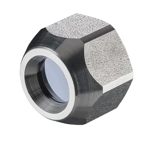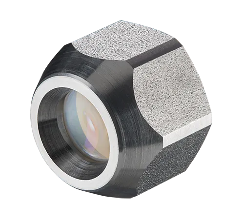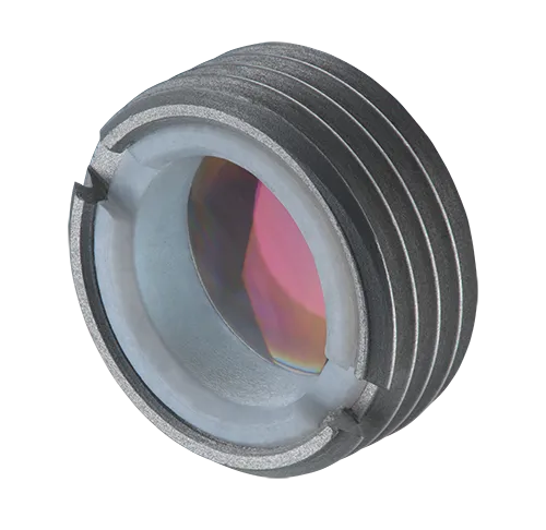 The Close Focus (CF) lens for compact pyrometers allows precise measurement of small objects in short distances, with the minimum spot size depending on the sensing version. It has specific transmission values for minimal signal loss. CF lenses come in internal or external thread types for direct installation to the sensor heads or integration into the massive housing or air purge. It is compatible with LT, 1M, 2M, 3M, and 4M models.