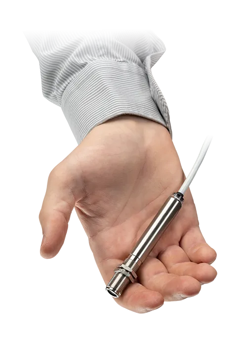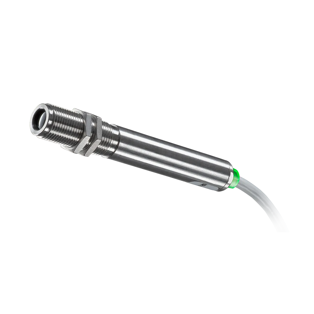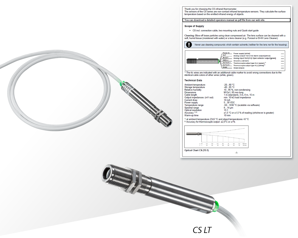 The CS LT Pyrometer stands out due to its low pricing and ease of use, making the infrared sensor a popular alternative to traditional contact-based temperature sensors. The unique thermal shock-resistant design ensures reliable measurements even in challenging conditions, unlike other low-budget sensors. The robust stainless steel measuring head, with an M12x1 thread, is easy to install in tight hot spaces without extra cooling, up to 80 °C. The compact sensing head measures just 85 mm in length and 12 mm in diameter. Additionally, the LED lighting on the back of the sensor serves as a visual alarm or error indicator, enhancing its functionality and reliability.