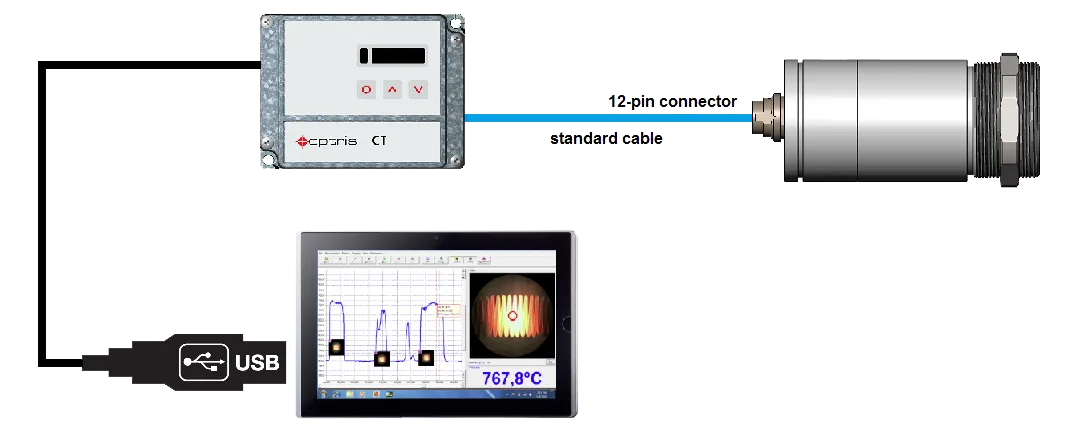 A CTvideo pyrometer features a two-piece design. The electronics box offers advanced signal processing flexibility with analog and digital outputs, including 0/4-20 mA, 0-5 V, 0-10 V, thermocouple, and USB.