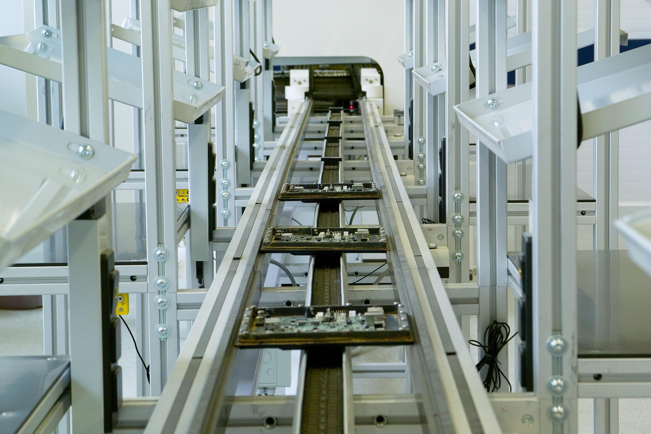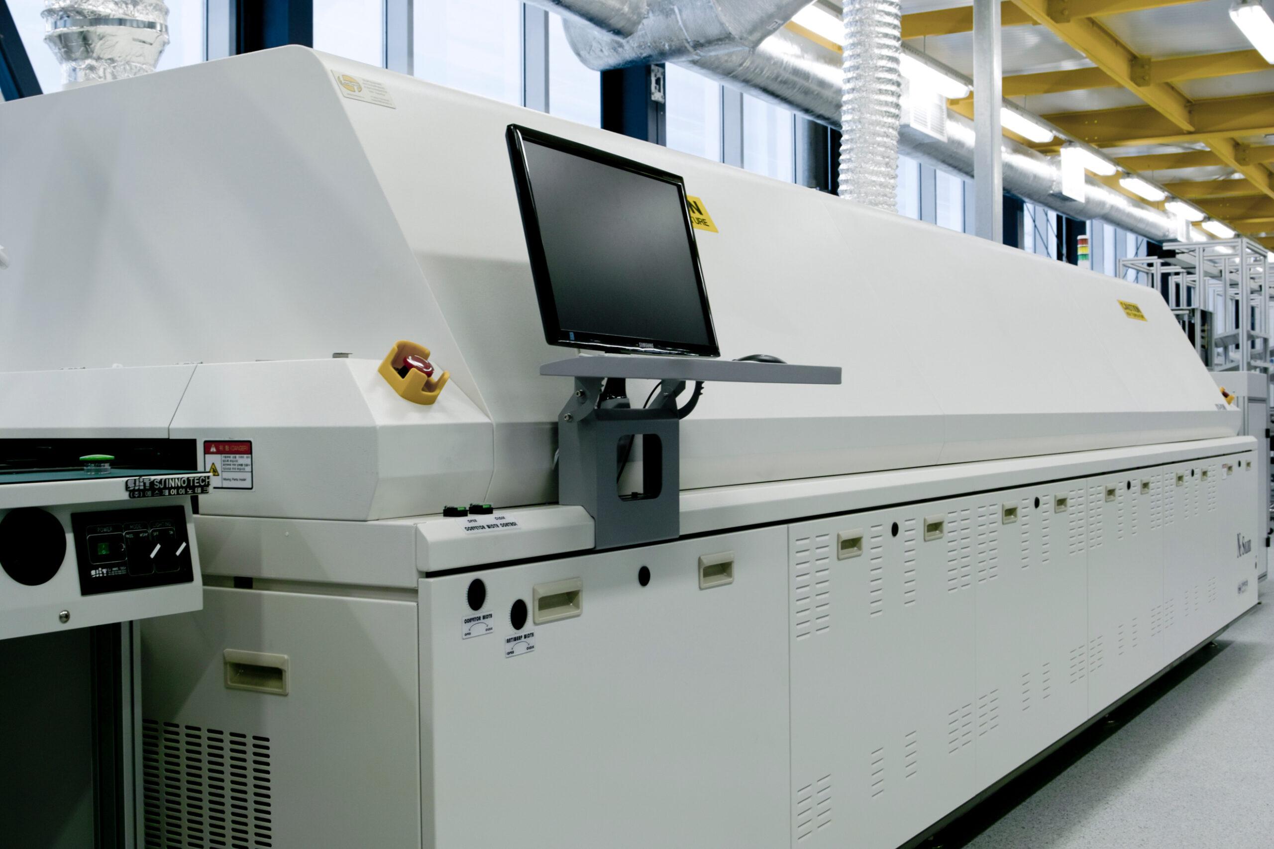 In high-volume commercial use, reflow ovens are long tunnels with conveyor belts that move PCBs through multiple, individually heated zones, each temperature controlled. Technicians adjust conveyor speed and zone temperatures to achieve a specific time and temperature profile.