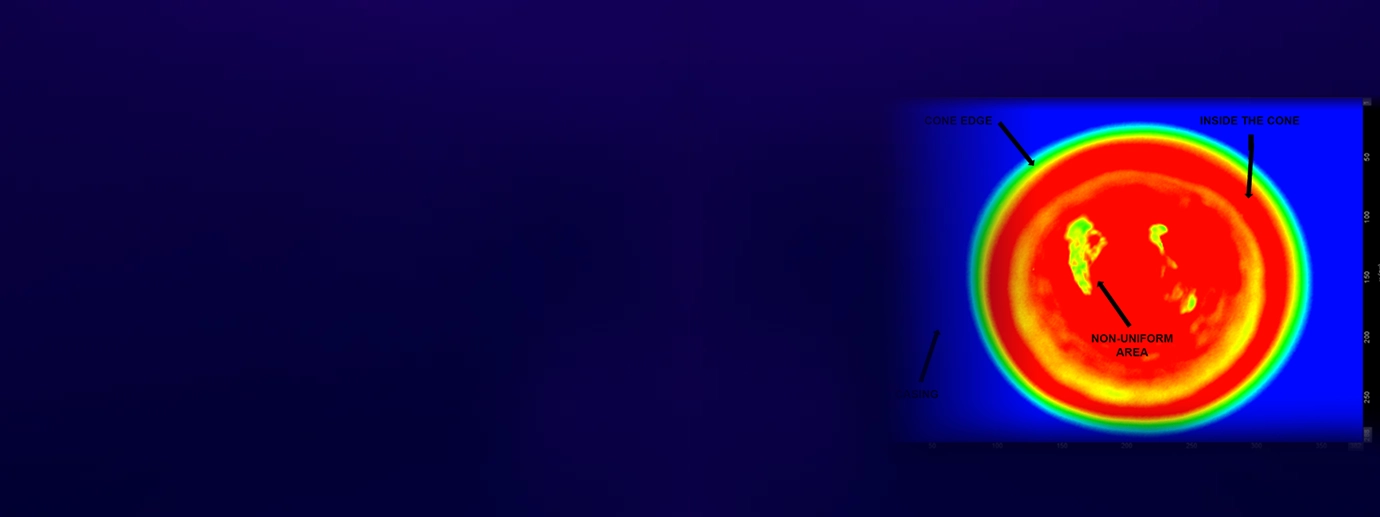 The thermal imaging system monitors chocolate spray temperature in real time, detecting uneven distribution and nozzle malfunctions. Integrated into the production line, it enables automatic removal of defective cones and ensures consistent coating through continuous thermal analysis.