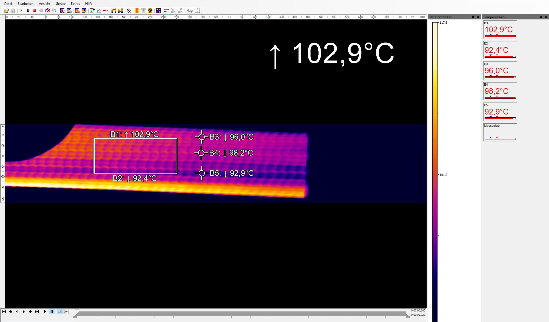 Using the Optris PIX Connect software, real-time thermal images are generated. The software allows for the creation of different measuring fields across the width of the hose, enabling precise temperature analysis in each area.