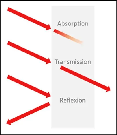 Electromagnetic radiation can interact with matter in three ways. It can be reflected or diffusely scattered back into the environment, transmitted by transparent objects, or absorbed in matter. In practical cases, one of these interactions often dominates. The law of conservation of energy requires that the sum of absorption (α), reflectivity (Ï), and transmissivity (Ï„) is equal to 100% or 1 = α + Ï + Ï„.