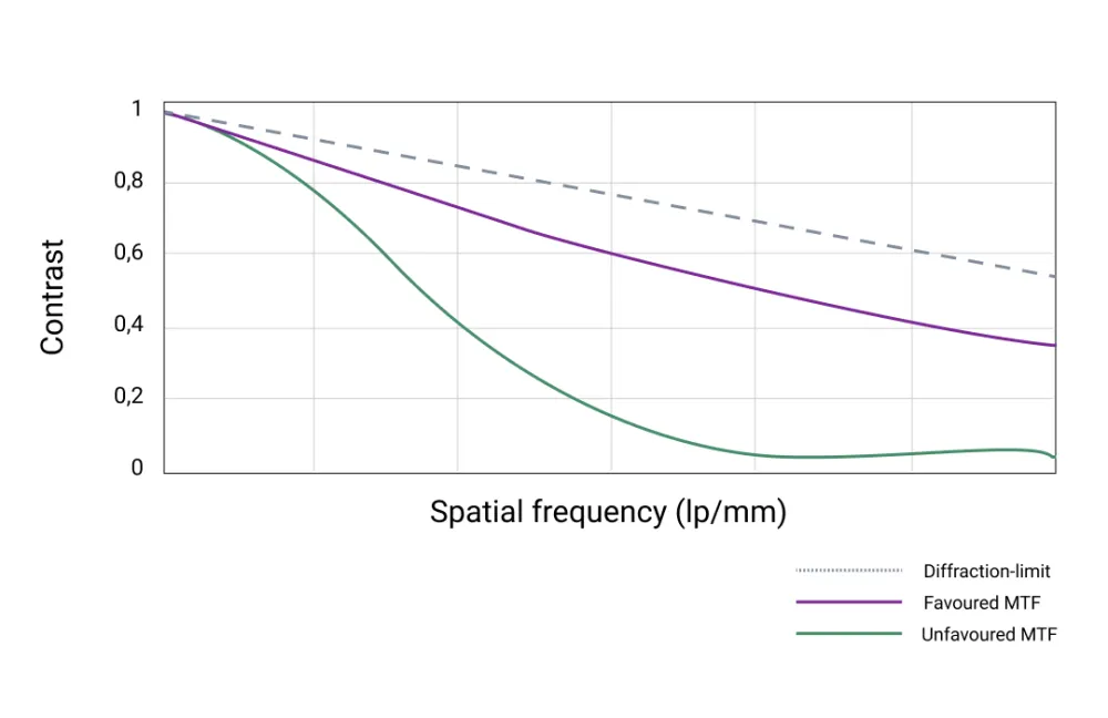 The Modulation Transfer Function (MTF) is a crucial metric used to characterize the performance of optical systems across various applications, from visual to long-wave infrared (LWIR) wavebands used in thermal imaging. MTF assesses how well a lens system can reproduce (transfer) detail from the object to the image, expressed as the contrast ratio of a sinusoidal pattern at different spatial frequencies. The resulting MTF curve shows the remaining contrast as a function of the spatial frequency. In this case, it is a method for describing the optical resolution and thus the measuring accuracy in the field of temperature measurement.