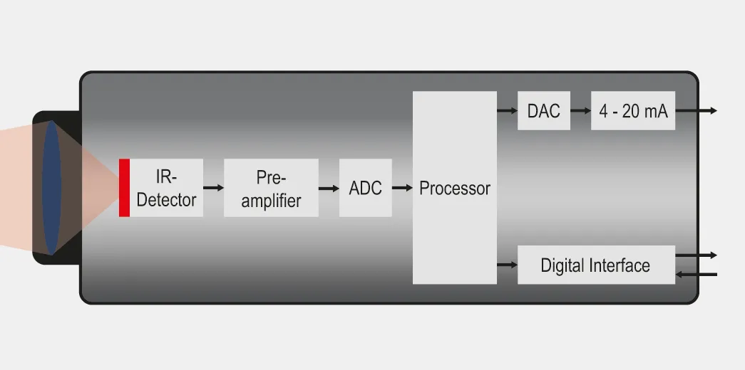 The emitted radiation is focused with optics through a spectral filter onto an infrared detector. The spectral filter generally selects the portion of the radiation that is spectrally within an atmospheric window. Depending on the technology used, the infrared detector converts the radiation into a photocurrent or a thermoelectric voltage. This signal is electronically amplified and converted into a digital signal that is directly proportional to the original radiant power at the detector. This signal is then digitally processed by calculating a set emissivity, background radiation, or the influence of the ambient temperature. Further processing steps, such as time averaging or more sophisticated methods like peak hold or valley hold, can be added to optimize the temperature indication.