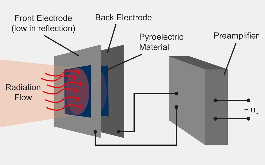 A pyroelectric detector is a type of thermal detector that operates based on the pyroelectric effect. This effect occurs when a temperature change in a pyroelectric material, typically a ceramic, causes a spontaneous polarization change, generating an electrical charge proportional to the temperature change. Pyroelectric detectors use this effect to detect infrared radiation. When the temperature of the pyroelectric material changes, the alignment of its molecular dipoles shifts, creating a temporary voltage across the material. This charge is proportional to the rate of temperature change.