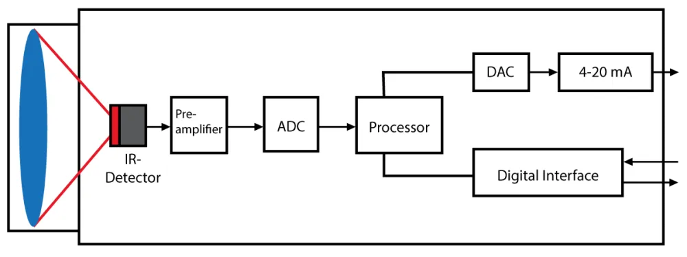 Pyrometers typically have three main components: an optical system, a detector, and electronics. When measuring the surface temperature of an object, the optical system captures the energy emitted by the object and focuses it on the detector, which is highly sensitive to the infrared bandwidth. The detector’s electrical signal depends on the temperature of the object, its ambient temperature, and its sensitivity. This weak electrical signal is then amplified and digitized by the pyrometer’s electronics. The digitized data is continuously corrected using calibration data, and then the temperature values are obtained, followed by further signal processing for analog or digital outputs, depending on the interfaces.
