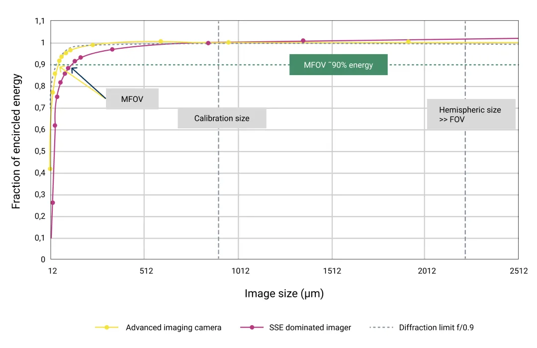 In contrast, a reduction in the source diameter due to the size of the calibration geometry leads to a reduction in the signal level on the detector. Consequently, the measurement spot for pyrometers is defined by 90% of the energy, which represents the minimum spot size diameter for accurate temperature measurement. For thermal imaging, the minimum spot size is described by the MFOV (Measurement Field of View), which typically represents 3×3 pixels. For small targets the size of the MFOV, the SSE is dominated by lens aberration and diffraction. The diffraction limit of the device depends purely on the wavelength and F-number, which is due to the physical diffraction limit rather than an imperfect optical system. In such cases, it is essential to consider the effects of increasing or decreasing the diameter of the radiation source, as a reduction often leads to a greater deviation in the temperature measurement.