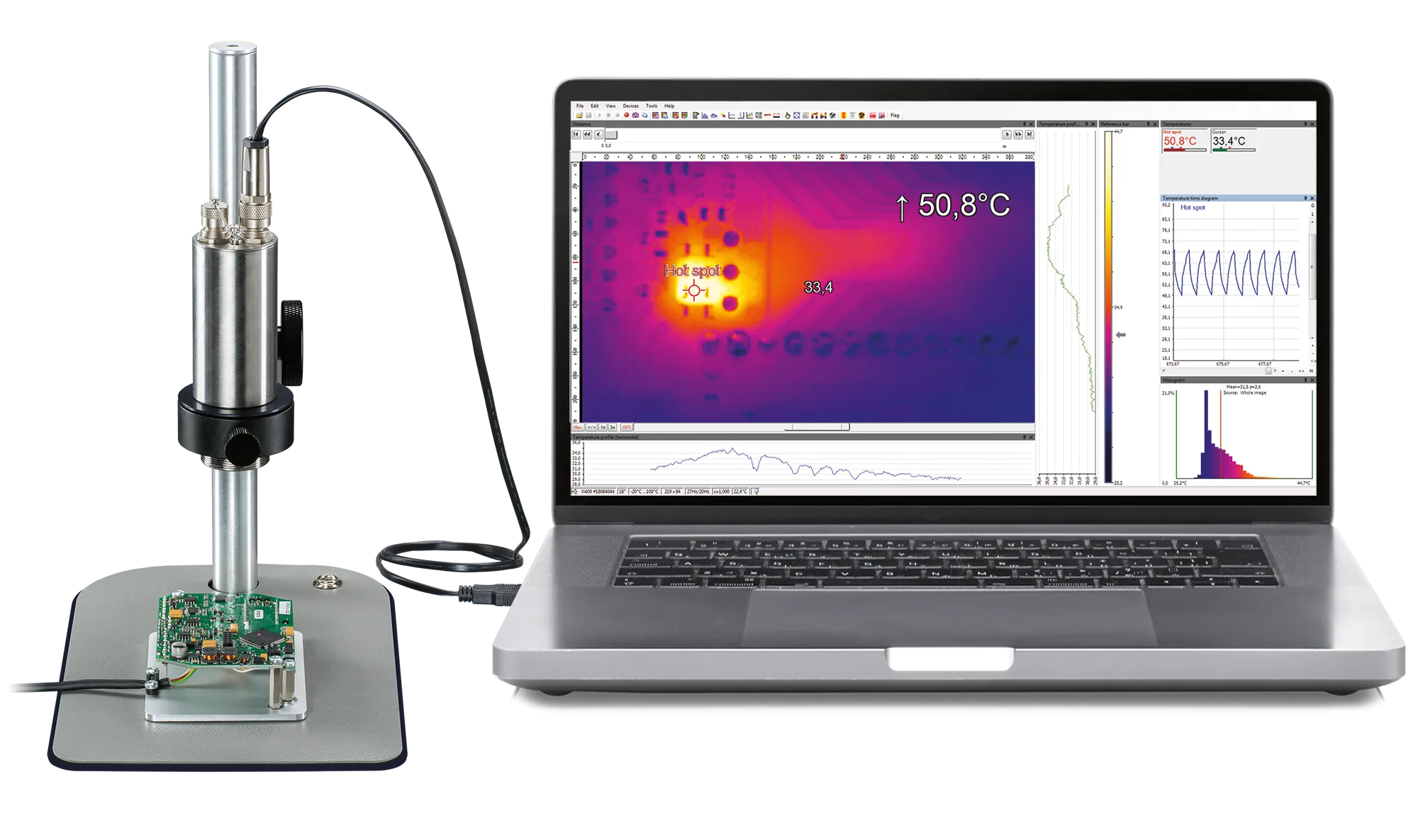 The Xi 400 with microscope optics is the most powerful infrared camera system for printed circuit board analysis and electrical component temperature measurement in the affordable 382 x 288 resolution range. It combines a long-wave infrared camera with a microscope stage for precise focus and German-designed infrared optics optimized for small target images and measurement. This powerful infrared camera package is available in most markets at a budget-friendly price.