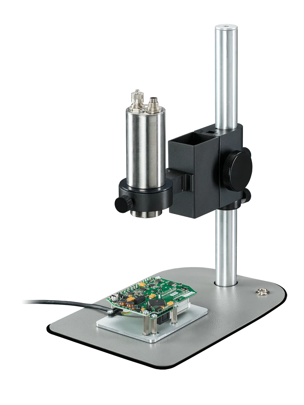 Macro focus can be performed using the knurled ring on the outside of the microscope objective but minute adjustments in working distance can dramatically improve image clarity and temperature measurement accuracy. Each microscope package’s stages facilitate this minute working distance adjustment. If the image is not in optimal focus, the temperature measurements will not be accurate.