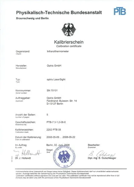 A Certificate of Calibration is an official document provided by a calibration laboratory or manufacturer that verifies an instrument’s accuracy and performance against recognized standards. This certificate includes detailed information such as the instrument’s model and serial number, calibration date, and the specific measurements and tolerances tested. It ensures that the instrument meets industry standards and specifications, providing traceability to national or international measurement standards. Either the European PTB standard or the NIST standard are supported. Additionally, it includes information about the calibration procedure, environmental conditions during calibration, and the credentials of the technician who performed the calibration. Regular calibration, documented by such certificates, is crucial for maintaining measurement precision, ensuring compliance with regulatory requirements, and supporting quality control processes in various industries.