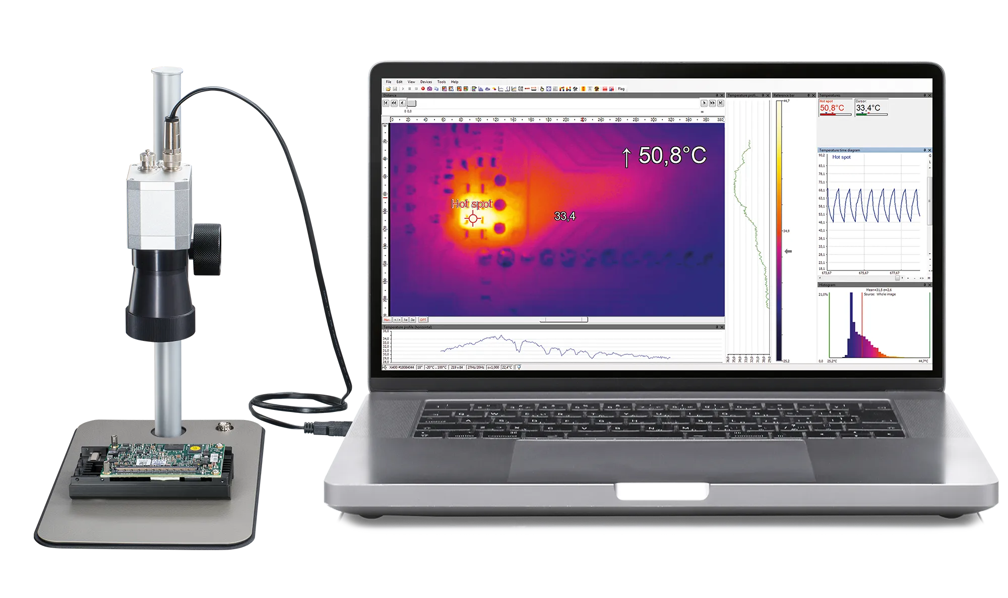 Yes. Four additional optics are available for the PI 640i and can be calibrated for use with the camera. This dramatically extends the PI 640i’s application potential, enabling thermal imaging and temperature measurement of full-size printed circuit boards or the products that host them. As with microscope optics, make sure to select the correct calibration file when switching optics.