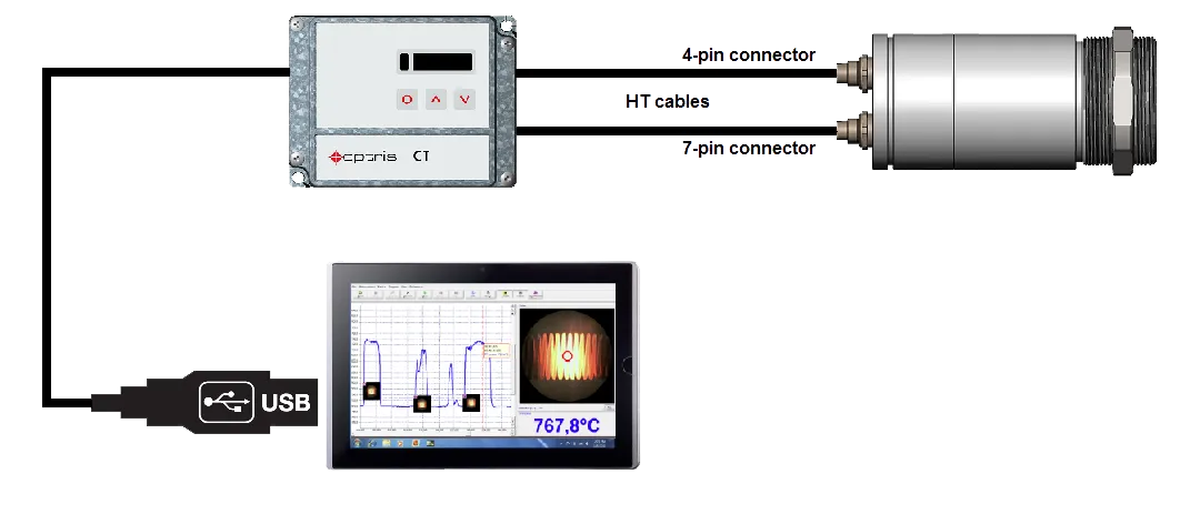 A CTvideo pyrometer features a two-piece design. The electronics box offers advanced signal processing flexibility with analog and digital outputs, including 0/4-20 mA, 0-5 V, 0-10 V, thermocouple, and USB.